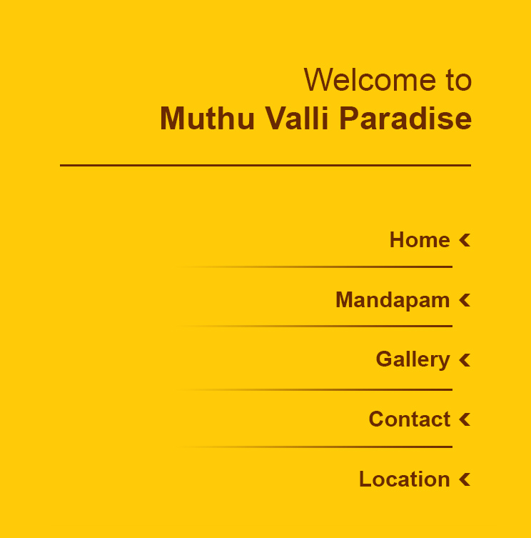 ![]() ![]() ![]() ![]() Muthu Valli ParadiseBest venue for Auspicious OccasionsMuthu Valli Paradise Kalyana Mandapam is one of the best and newest Venue for all Auspicious Occasions, located at Panchetty (Ponneri Taluk). Our Venue is ideal for all functions like Engagement, Wedding Reception, Marriage, Birthday Party, Anniversary, Naming Ceremony etc.. and can accommodate up to 1000 guests with a seating capacity of 1000 and 250 in dining. Our Venue offers both a wedding hall and rooms for your comfortable stay surely gives a special touch to your big day. The lavish decor of the venue will be appealing and catches your attention instantly when you enter its premises. Very convenient to reach by road and train, the venue is located 7 Km’s from Ponneri Railway Station. Locate us for wedding hall at ponneri © 2021 - Muthu Valli Paradise - Ponneri and Red Hills