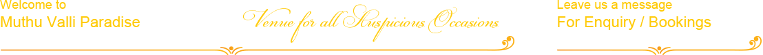 Muthu Valli Paradise Kalyana Mandapam is one of the best and newest Venue for all Auspicious Occasions, located at Panchetty (Ponneri Taluk). Our Venue is ideal for all functions like Engagement, Wedding Reception, Marriage, Birthday Party, Anniversary, Naming Ceremony etc.. and can accommodate up to 1000 guests with a seating capacity of 1000 and 250 in dining.
